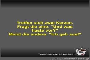 | Treffen sich zwei Kerzen Bild (24.92 KB) 3Lustiges → klasse Sprüche und Witze | Lustiges → klasse Sprüche und Witze | 13.04.22-12:53 | Fossy | |