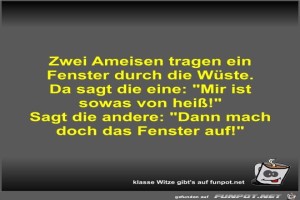 | Zwei Ameisen tragen ein Fenster durch die Wüste Bild (35.01 KB) 4Lustiges → klasse Sprüche und Witze | Lustiges → klasse Sprüche und Witze | 04.03.22-14:55 | Fossy | |