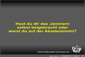 | Hast du dir das Jammern selbst beigebracht oder warst du... Bild (22.6 KB) 6Lustiges → klasse Sprüche und Witze | Lustiges → klasse Sprüche und Witze | 04.03.22-08:00 | Fossy | |