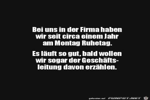 | Montag ist Ruhetag Bild (35.42 KB) 14Lustiges → klasse Sprüche und Witze | Lustiges → klasse Sprüche und Witze | 24.02.22-07:43 | Rebecca | |