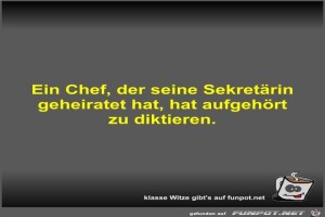 | Ein Chef, der seine Sekretärin geheiratet hat, hat... Bild (22.25 KB) 5Lustiges → klasse Sprüche und Witze | Lustiges → klasse Sprüche und Witze | 19.01.22-08:13 | Fossy | |