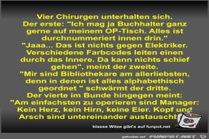 | Vier Chirurgen unterhalten sich Bild (70.25 KB) 6Lustiges → klasse Sprüche und Witze | Lustiges → klasse Sprüche und Witze | 17.01.22-10:57 | Fossy | |