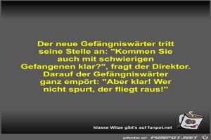 | Der neue Gefängniswärter tritt seine Stelle an Bild (35.34 KB) 11Lustiges → klasse Sprüche und Witze | Lustiges → klasse Sprüche und Witze | 12.01.22-08:26 | Fossy | |