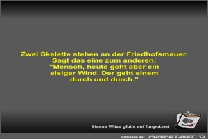 | Zwei Skelette stehen an der Friedhofsmauer Bild (24.4 KB) 5Lustiges → klasse Sprüche und Witze | Lustiges → klasse Sprüche und Witze | 07.01.22-08:11 | Fossy | |