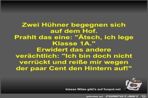 | Zwei Hühner begegnen sich auf dem Hof Bild (41.89 KB) 8Lustiges → klasse Sprüche und Witze | Lustiges → klasse Sprüche und Witze | 09.01.22-13:35 | Fossy | |