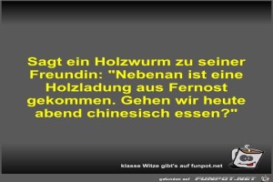 | Sagt ein Holzwurm zu seiner Freundin Bild (34.55 KB) 9Lustiges → klasse Sprüche und Witze | Lustiges → klasse Sprüche und Witze | 09.01.22-10:48 | Fossy | |
