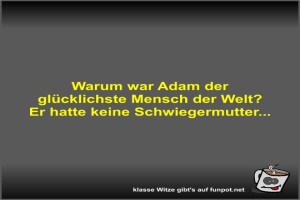| Warum war Adam der glücklichste Mensch der Welt? Bild (23.8 KB) von Fossy am 22. Mai 2025 um 18:29 Uhr Lustiges → klasse Sprüche und Witze | Lustiges → klasse Sprüche und Witze | 22.05.-18:29 | Fossy | ||