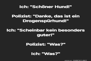 | Lustiger Dialog mit Drogenhund Bild (48.47 KB) 2Lustiges → klasse Sprüche und Witze | Lustiges → klasse Sprüche und Witze | 22.05.-16:16 | ||