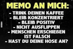 | Memo für einen produktiven Tag Bild (77.02 KB) 1Lustiges → klasse Sprüche und Witze | Lustiges → klasse Sprüche und Witze | 22.05.-17:40 | Erna70 | |