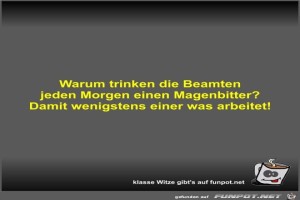 | Warum trinken die Beamten jeden Morgen einen Magenbitter? Bild (22.86 KB) 8Lustiges → klasse Sprüche und Witze | Lustiges → klasse Sprüche und Witze | 24.12.21-08:47 | Fossy | |
