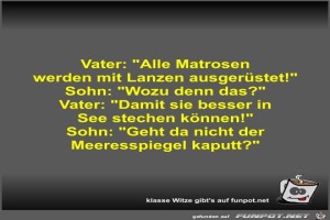| Vater: "Alle Matrosen werden mit Lanzen ausgerüstet!" Bild (36.41 KB) 9Lustiges → klasse Sprüche und Witze | Lustiges → klasse Sprüche und Witze | 20.12.21-14:33 | Fossy | |