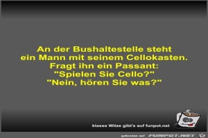 | An der Bushaltestelle steht ein Mann mit seinem Cellokasten Bild (28.44 KB) 6Lustiges → klasse Sprüche und Witze | Lustiges → klasse Sprüche und Witze | 15.12.21-08:05 | Fossy | |