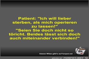 | Patient: Ich will lieber sterben Bild (33.37 KB) 7Lustiges → klasse Sprüche und Witze | Lustiges → klasse Sprüche und Witze | 10.12.21-11:08 | Fossy | |