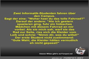 | Zwei Informatik-Studenten fahren über den Campus Bild (50.6 KB) 7Lustiges → klasse Sprüche und Witze | Lustiges → klasse Sprüche und Witze | 11.12.21-11:41 | Fossy | |