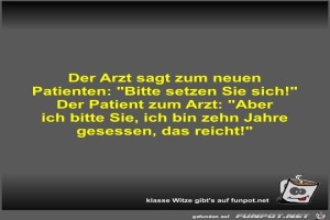 | Der Arzt sagt zum neuen Patienten Bild (29.87 KB) 7Lustiges → klasse Sprüche und Witze | Lustiges → klasse Sprüche und Witze | 04.12.21-08:01 | Fossy | |
