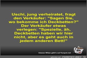 | Uschi, jung verheiratet, fragt den Verkäufer Bild (43.17 KB) 7Lustiges → klasse Sprüche und Witze | Lustiges → klasse Sprüche und Witze | 02.12.21-13:46 | Fossy | |