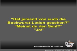 | Hat jemand von euch die Bockwurst-Lotion gesehen? Bild (23.99 KB) 11Lustiges → klasse Sprüche und Witze | Lustiges → klasse Sprüche und Witze | 23.11.21-08:00 | Fossy | |