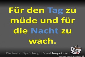 | Müde Bild (60.37 KB) 11Lustiges → klasse Sprüche und Witze Ja, es wäre schön, wenn ich in der Nacht mal besser schlafen könnte, damit ich tagsüber nicht so müde bin. | Lustiges → klasse Sprüche und Witze | 16.11.21-10:52 | ||