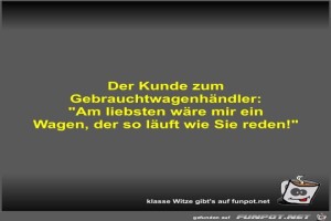 | Der Kunde zum Gebrauchtwagenhändler Bild (23.38 KB) 5Lustiges → klasse Sprüche und Witze | Lustiges → klasse Sprüche und Witze | 16.11.21-08:00 | Fossy | |