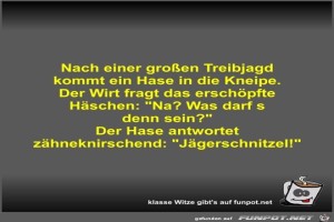 | Nach einer großen Treibjagd kommt ein Hase in die Kneipe Bild (33.49 KB) 8Lustiges → klasse Sprüche und Witze | Lustiges → klasse Sprüche und Witze | 12.11.21-14:21 | Fossy | |