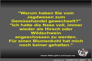 | Warum haben Sie vom Jagdwesen zum Gemüsehandel gewechselt? Bild (43.99 KB) 12Lustiges → klasse Sprüche und Witze | Lustiges → klasse Sprüche und Witze | 13.11.21-08:02 | Fossy | |