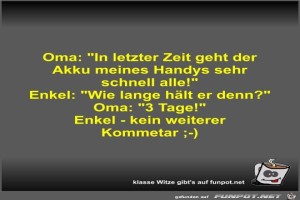 | Oma: In letzter Zeit geht der Akku meines Handys sehr... Bild (33.67 KB) 5Lustiges → klasse Sprüche und Witze | Lustiges → klasse Sprüche und Witze | 07.11.21-17:04 | Fossy | |