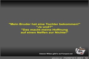 | "Mein Bruder hat eine Tochter bekommen!" Bild (20.87 KB) 13Lustiges → klasse Sprüche und Witze | Lustiges → klasse Sprüche und Witze | 31.10.21-12:05 | Fossy | |