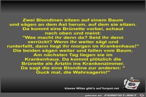 | Zwei Blondinen sitzen auf einem Baum und sägen an dem Ast... Bild (54.11 KB) 6Lustiges → klasse Sprüche und Witze | Lustiges → klasse Sprüche und Witze | 29.10.21-10:52 | Fossy | |