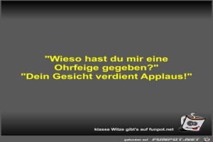 | Wieso hast du mir eine Ohrfeige gegeben? Bild (22.07 KB) 6Lustiges → klasse Sprüche und Witze | Lustiges → klasse Sprüche und Witze | 25.10.21-08:03 | Fossy | |
