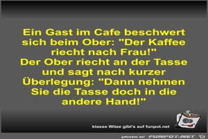 | Ein Gast im Cafe beschwert sich beim Ober Bild (43.59 KB) 8Lustiges → klasse Sprüche und Witze | Lustiges → klasse Sprüche und Witze | 12.10.21-14:20 | Fossy | |