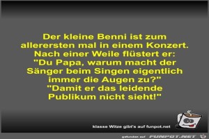 | Der kleine Benni ist zum allerersten mal in einem Konzert Bild (40.61 KB) 6Lustiges → klasse Sprüche und Witze | Lustiges → klasse Sprüche und Witze | 11.10.21-17:41 | Fossy | |
