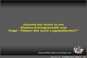 | Kommt ein Huhn in ein Elektro-Fachgeschäft und fragt Bild (20.35 KB) 10Lustiges → klasse Sprüche und Witze | Lustiges → klasse Sprüche und Witze | 05.10.21-08:00 | Fossy | |
