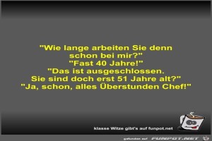 | Wie lange arbeiten Sie denn schon bei mir? Bild (29.08 KB) 9Lustiges → klasse Sprüche und Witze | Lustiges → klasse Sprüche und Witze | 04.10.21-12:46 | Fossy | |