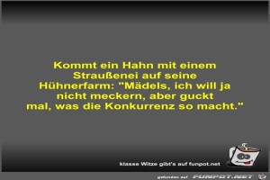 | Kommt ein Hahn mit einem Straußenei auf seine Hühnerfarm Bild (28.52 KB) 7Lustiges → klasse Sprüche und Witze | Lustiges → klasse Sprüche und Witze | 29.09.21-10:47 | Fossy | |