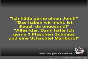 | "Ich hätte gerne einen Joint!" Bild (36.13 KB) 8Lustiges → klasse Sprüche und Witze | Lustiges → klasse Sprüche und Witze | 13.09.21-08:45 | Fossy | |