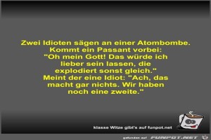 | Zwei Idioten sägen an einer Atombombe Bild (34.38 KB) 7Lustiges → klasse Sprüche und Witze | Lustiges → klasse Sprüche und Witze | 15.09.21-16:31 | Fossy | |