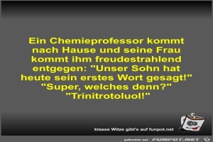 | Ein Chemieprofessor kommt nach Hause und seine Frau kommt... Bild (38.22 KB) 6Lustiges → klasse Sprüche und Witze | Lustiges → klasse Sprüche und Witze | 26.08.21-16:33 | Fossy | |
