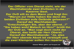| Der Offizier vom Dienst sieht Bild (68.36 KB) 6Lustiges → klasse Sprüche und Witze | Lustiges → klasse Sprüche und Witze | 27.08.21-11:21 | Fossy | |
