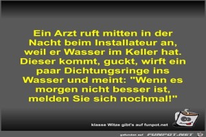 | Ein Arzt ruft mitten in der Nacht beim Installateur an Bild (45.39 KB) 6Lustiges → klasse Sprüche und Witze | Lustiges → klasse Sprüche und Witze | 24.08.21-16:57 | Fossy | |