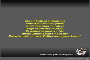 | Als ein Patient endlich aus dem Wartezimmer geholt wird Bild (26.94 KB) 8Lustiges → klasse Sprüche und Witze | Lustiges → klasse Sprüche und Witze | 24.08.21-13:39 | Fossy | |