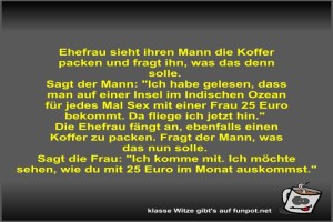 | Ehefrau sieht ihren Mann die Koffer packen und fragt ihn Bild (49.79 KB) 2Lustiges → klasse Sprüche und Witze | Lustiges → klasse Sprüche und Witze | 07.05.-11:40 | Fossy | |