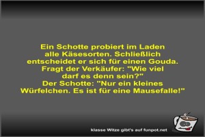 | Ein Schotte probiert im Laden alle Käsesorten Bild (34.07 KB) 2Lustiges → klasse Sprüche und Witze | Lustiges → klasse Sprüche und Witze | 09.05.-09:45 | Fossy | |