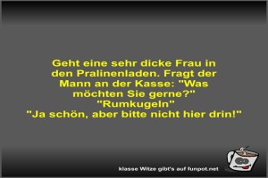 | Geht eine sehr dicke Frau in den Pralinenladen Bild (28.91 KB) 2Lustiges → klasse Sprüche und Witze | Lustiges → klasse Sprüche und Witze | 10.05.-11:02 | Fossy | |