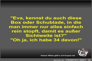 | Eva, kennst du auch diese Box oder Schublade, in die man... Bild (37.12 KB) 16Lustiges → klasse Sprüche und Witze | Lustiges → klasse Sprüche und Witze | 17.08.21-08:02 | Fossy | |