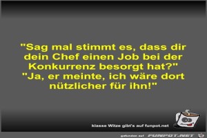 | Sag mal stimmt es, dass dir dein Chef einen Job bei der... Bild (32.58 KB) 8Lustiges → klasse Sprüche und Witze | Lustiges → klasse Sprüche und Witze | 13.08.21-08:09 | Fossy | |