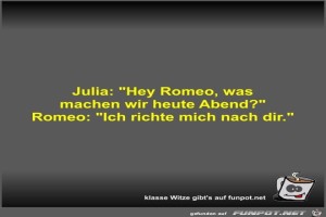 | Julia: Hey Romeo, was machen wir heute Abend? Bild (21.73 KB) 7Lustiges → klasse Sprüche und Witze | Lustiges → klasse Sprüche und Witze | 12.08.21-08:02 | Fossy | |
