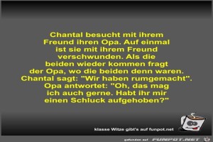 | Chantal besucht mit ihrem Freund ihren Opa Bild (42.54 KB) 12Lustiges → klasse Sprüche und Witze | Lustiges → klasse Sprüche und Witze | 12.08.21-16:15 | Fossy | |