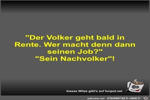 | Der Volker geht bald in Rente Bild (24.85 KB) 7Lustiges → klasse Sprüche und Witze | Lustiges → klasse Sprüche und Witze | 06.08.21-08:01 | Fossy | |