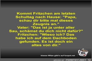 | Kommt Fritzchen am letzten Schultag nach Hause Bild (44.05 KB) 9Lustiges → klasse Sprüche und Witze | Lustiges → klasse Sprüche und Witze | 31.07.21-11:02 | Fossy | |