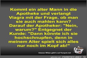 | Kommt ein alter Mann in die Apotheke und verlangt Viagra... Bild (53.3 KB) 5Lustiges → klasse Sprüche und Witze | Lustiges → klasse Sprüche und Witze | 31.07.21-14:13 | Fossy | |